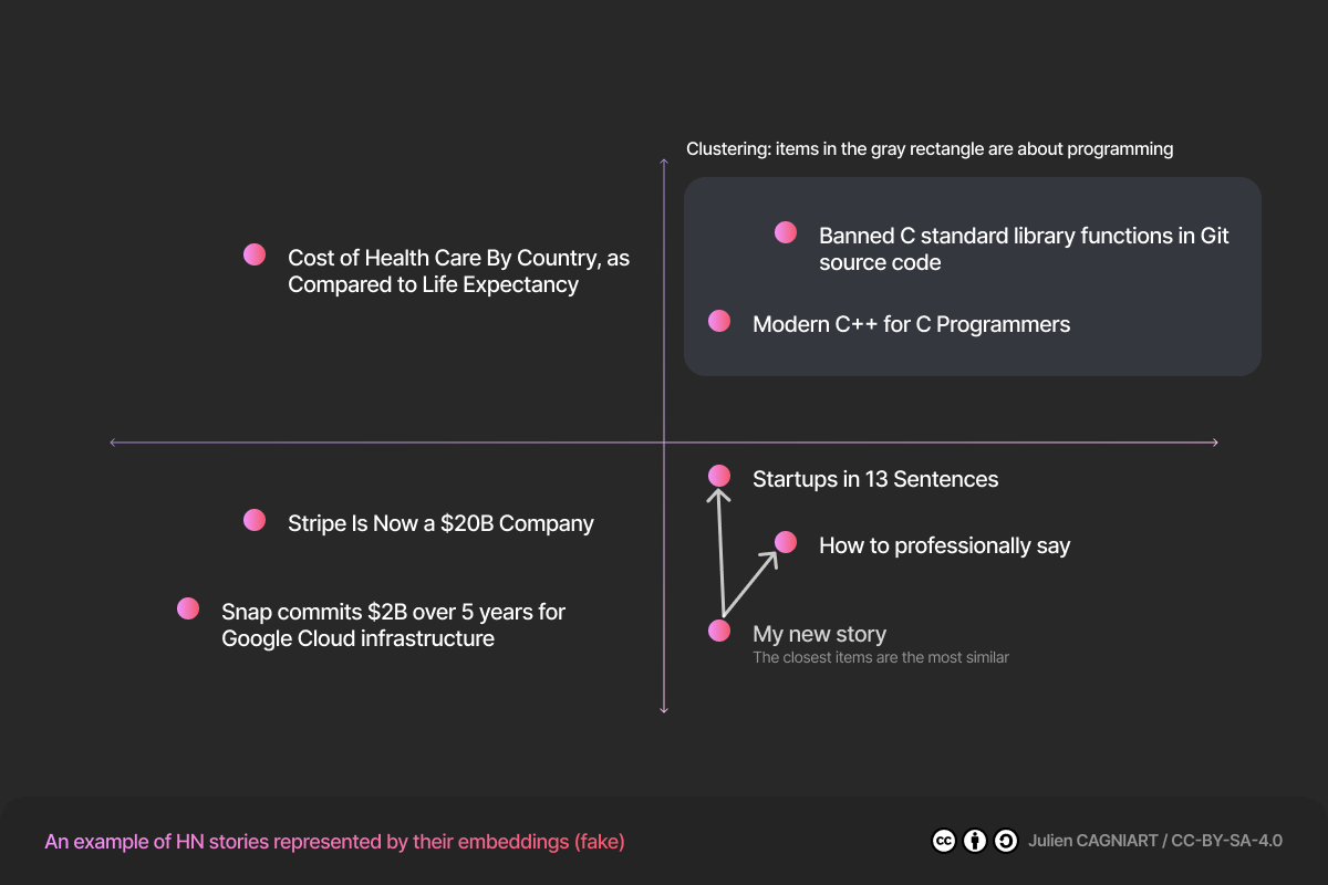 Let’s say we have 7 posts from Hacker News, and we are computing their embeddings using a fake model: