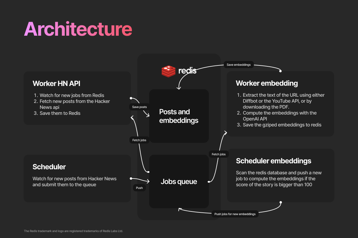 - Redis manages the job queues, the post metadata and the embeddings